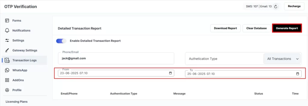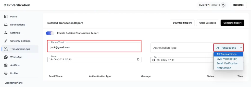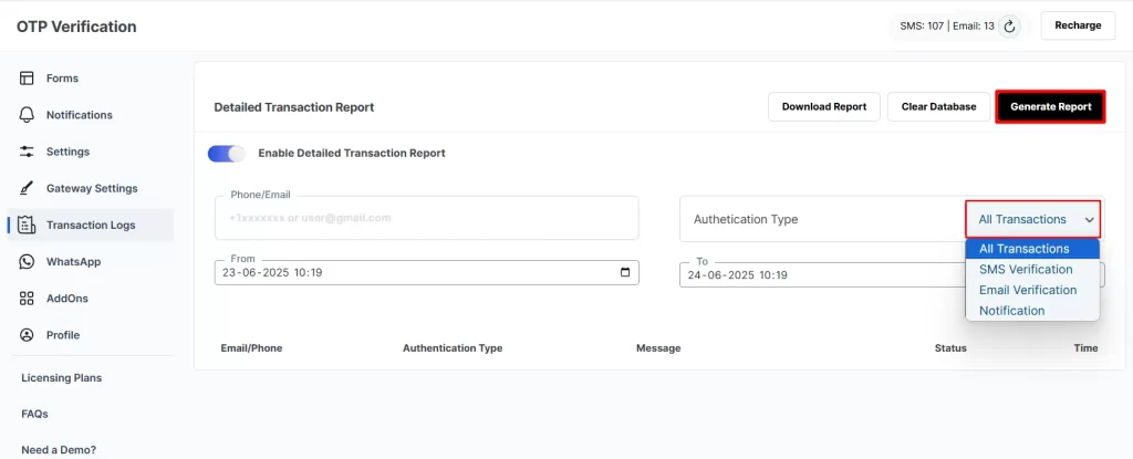 - If you want to view transaction reports for all users, leave the Phone/Email field blank and select the authentication type from the dropdown. Then, click the Generate Report button.