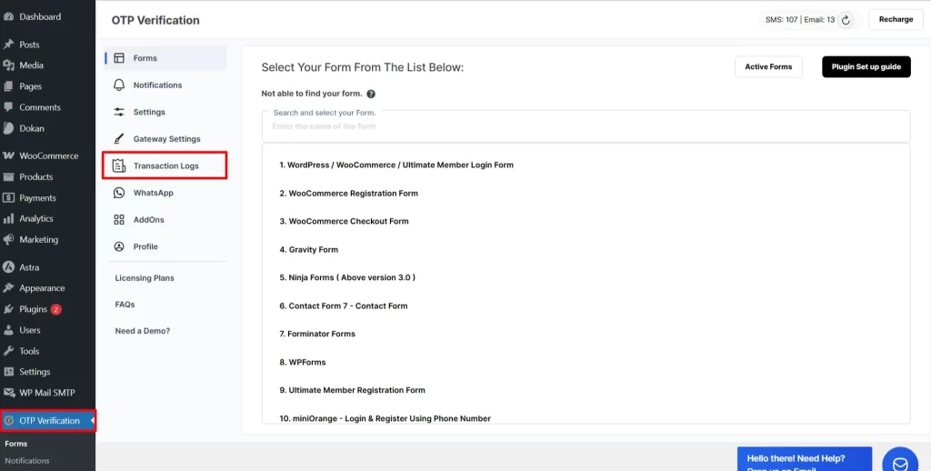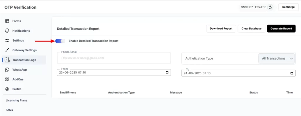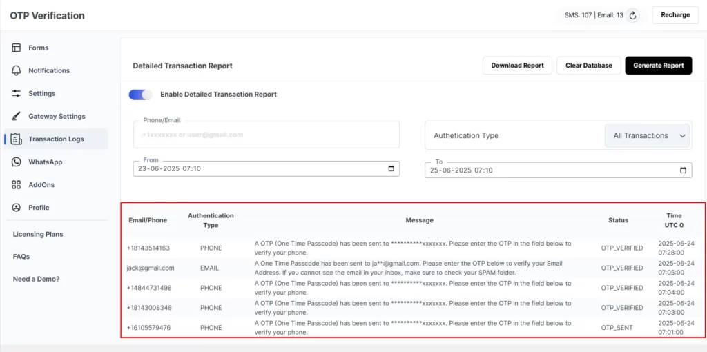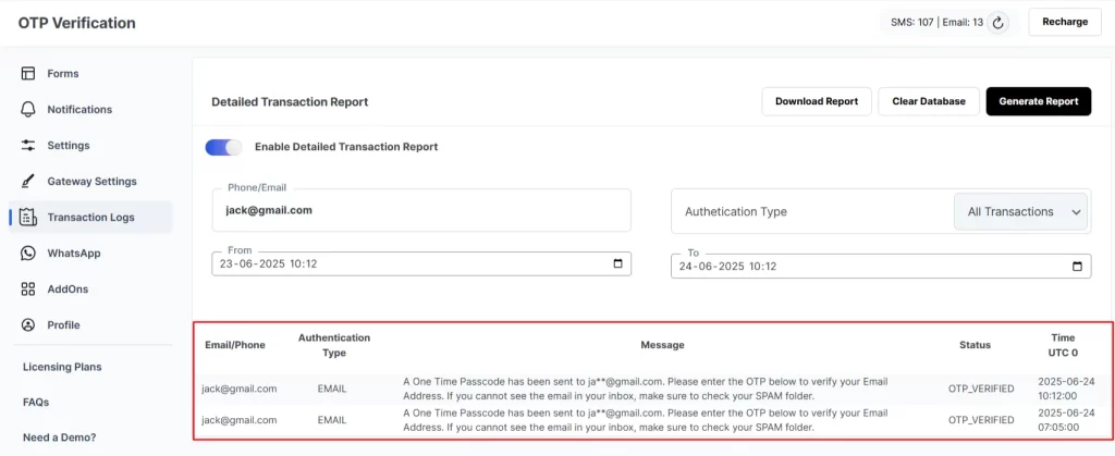 - Go to the Transaction Logs tab in the miniOrange OTP Verification plugin.