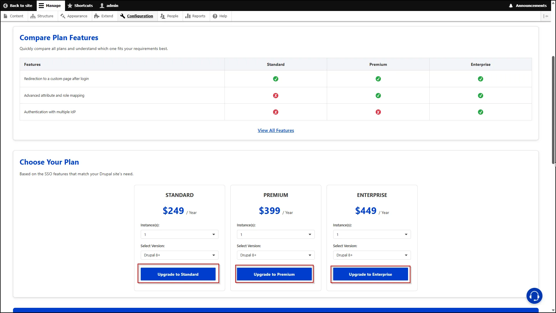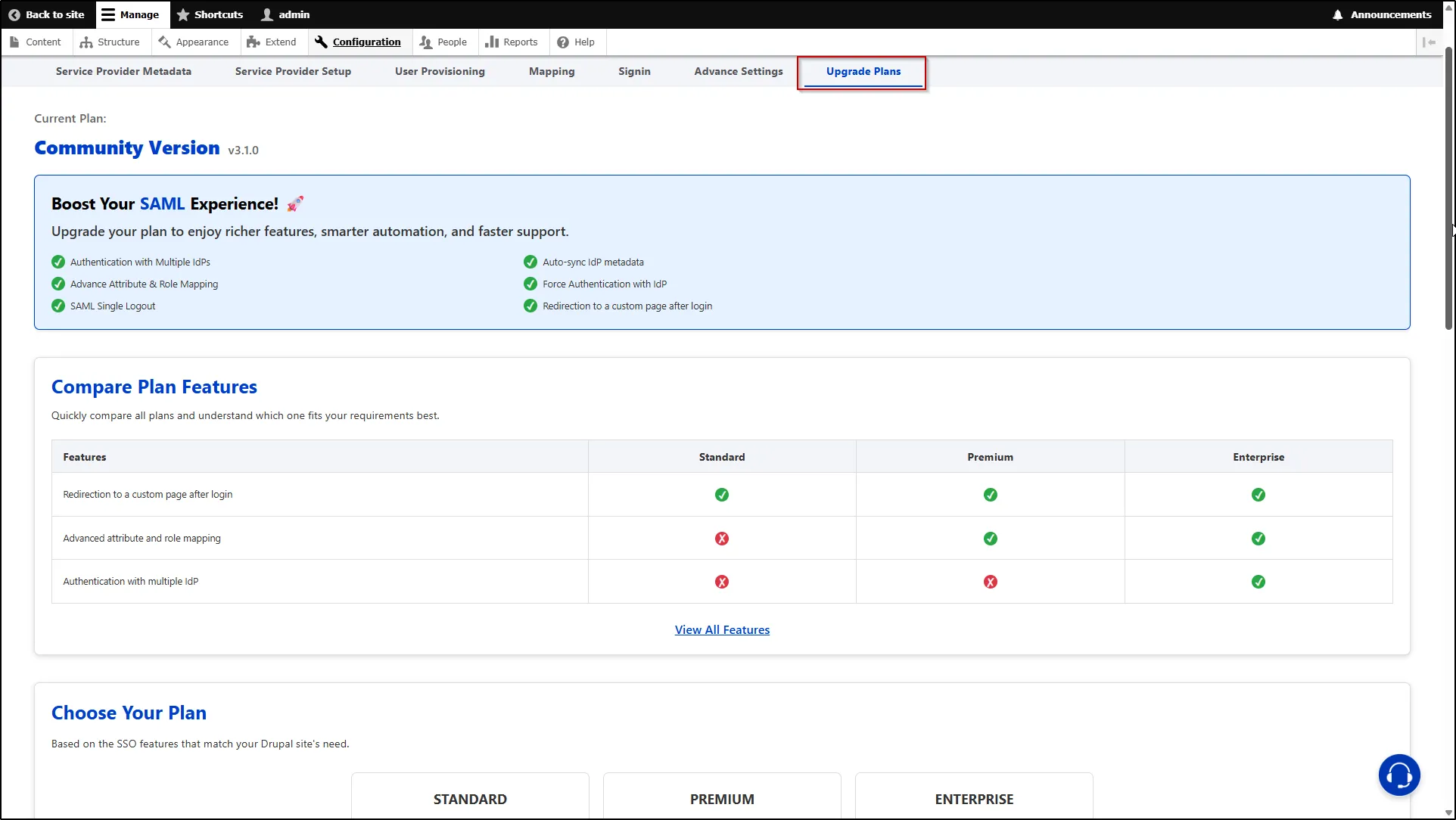 1. Navigate to the Upgrade tab of the miniOrange Drupal SAML SP module.