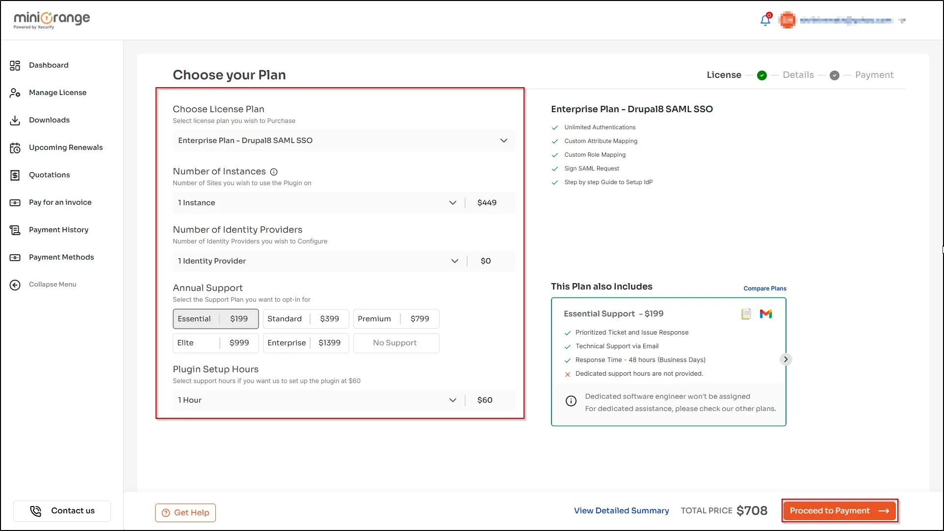 3. On the miniOrange payment portal, select plan, number of instances, number of IdP, support and setup hours.