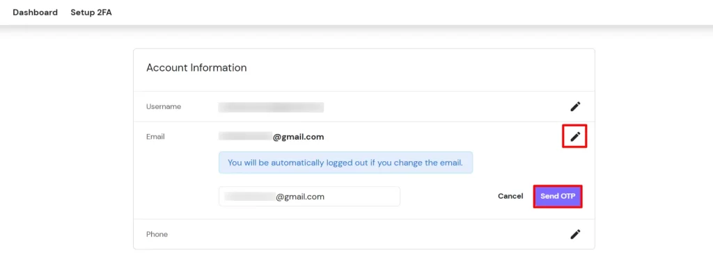 - Enter the email address you want to set as the new registered email and click on the Send OTP button.